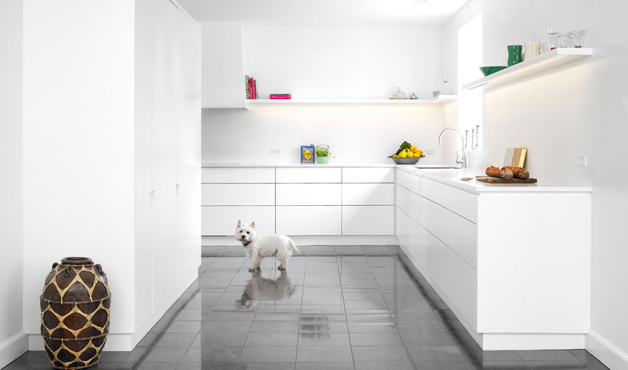 White Corian Kitchen with Marble Floors
