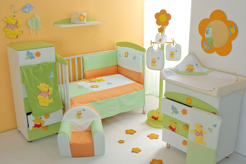 Baby Crib Furniture Set with Orange and Green Winnie the Pooh Decor