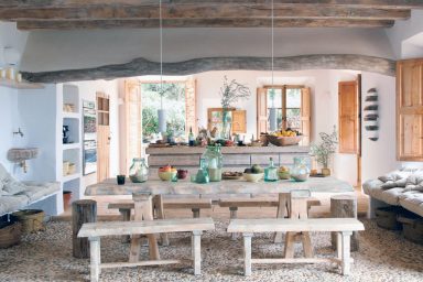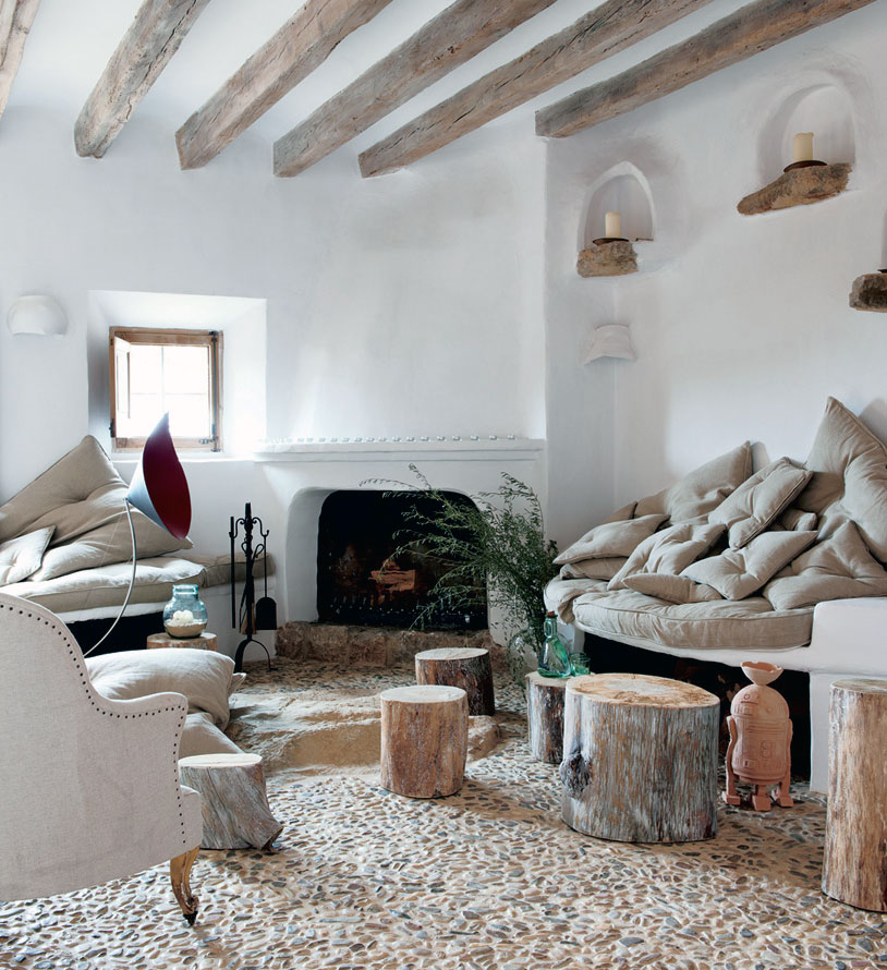 Cave Home Rustic Lounge with Fireplace. Home of French fashion and furniture designer Alexandre de Betak.