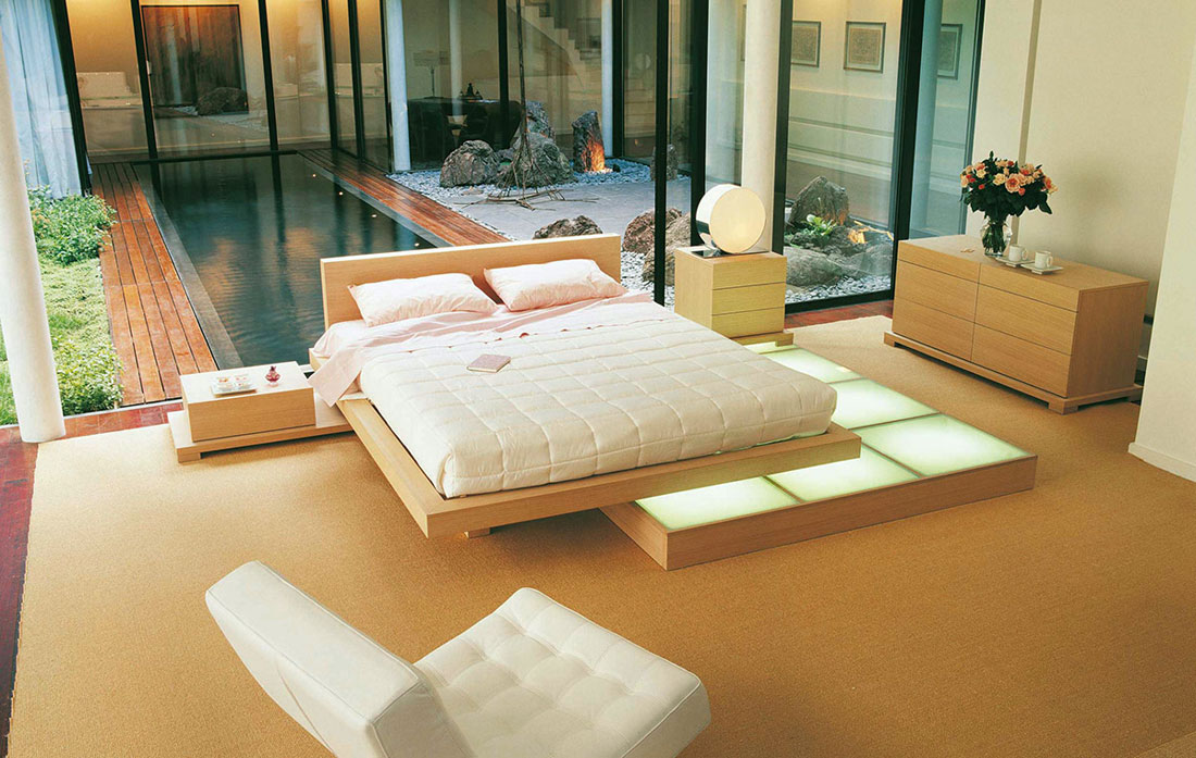 Need more home deco ideas? View more Beech Wood Platform Bedroom Beside Small Pool Ideas and Modern Bedrooms Design by Roche Bobois images: