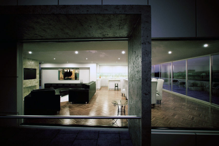 Minimalist Open Plan Livingroom Decor. Modern living room with glass wall.