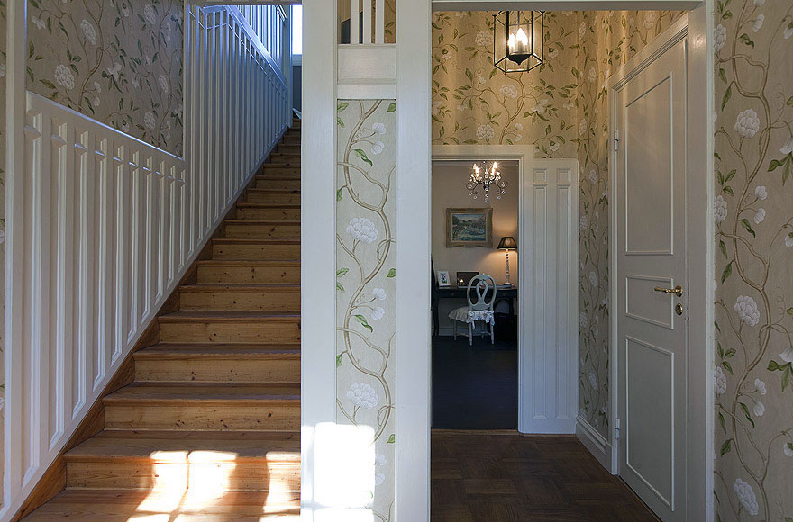 Cool design wooden staircase with flower wall print. Century house reconstructed Sweden.