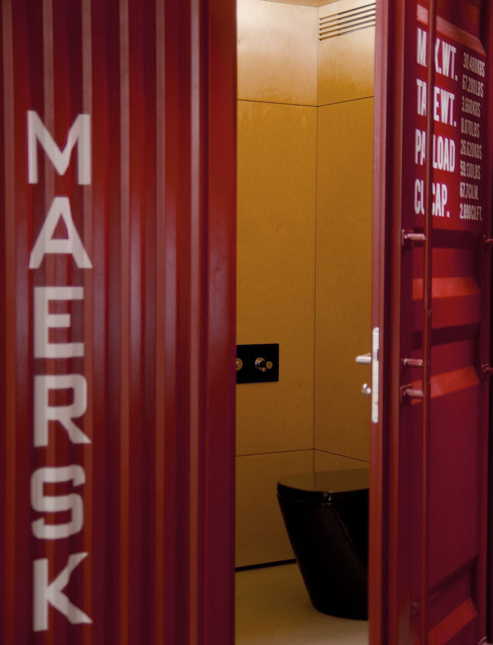 You are viewing our image titled Small Container Bathroom with Yellow and Red Color. This photo is part of our article about Modern Open Plan Loft in Ukraine. For more information and inspiration about Modern Open Plan Loft in Ukraine be sure to visit that page.