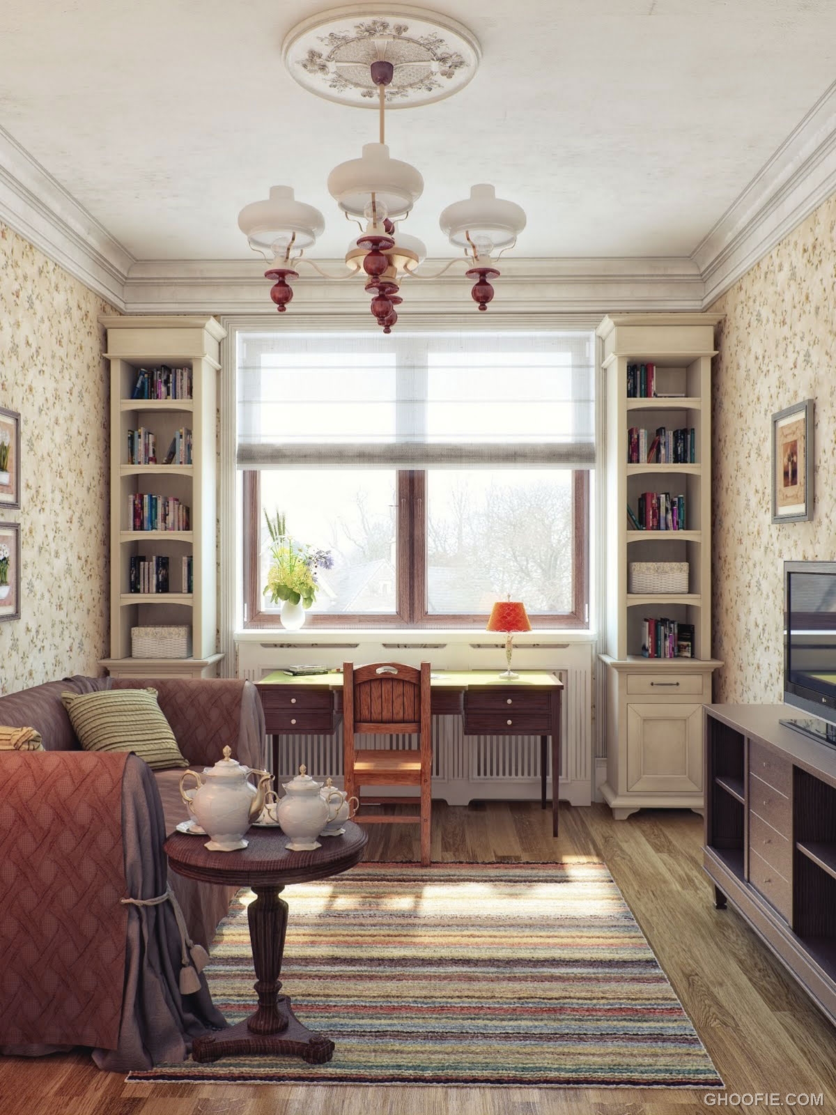 Elegant living room with classic chandelier by freelance architectural visualiser and illustrator, Svetlana Nezus.