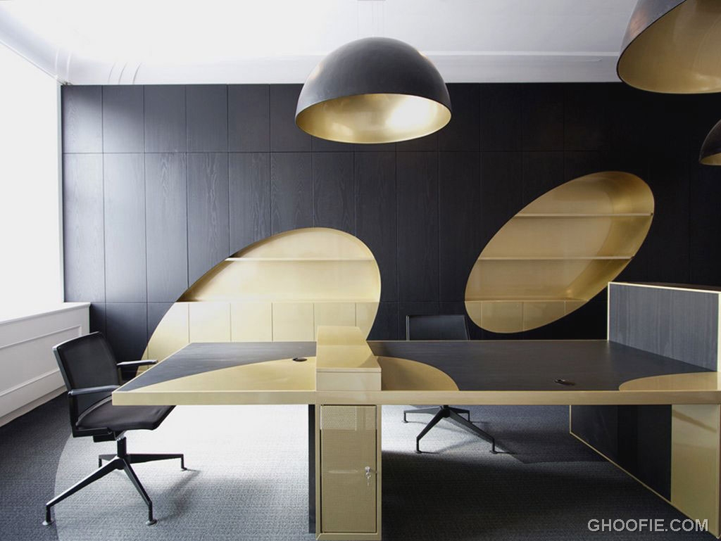 The photo shows an elegant side view of the black office design. Gold black contras color office wood furniture.