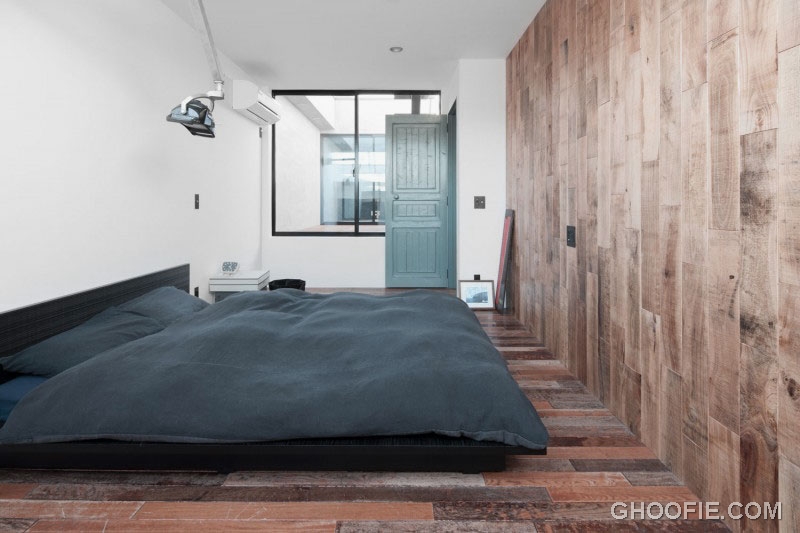 Contemporary bedroom design ideas with big bed. This room design combines the concepts of concrete and wood that looks charming. There are spotlights and air conditioner.